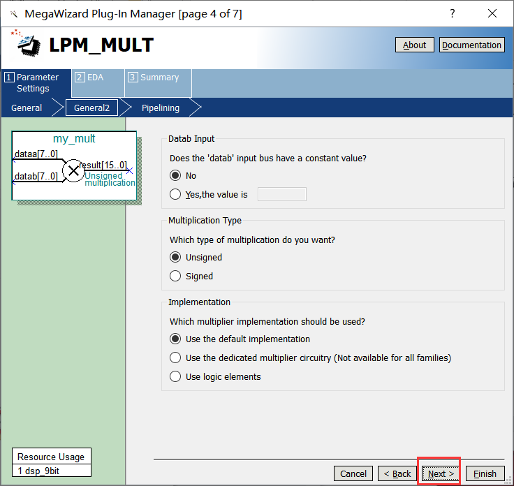 4、在框1处选择乘法器输入数据的宽度,此处以8位宽度为例,如下图所示,然后点击Next。