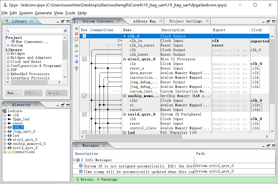 1、首先打开实验十八里面建立的工程(所有路径保持不变),如图所示: 图19-1 2、选择Tools→Qsys,如图所示: 图19-2 3、打开已有的noisII工程,如图所示: 图19-3 图19-4 4、进入后界面如图所示: 图19-5 5、在界面左侧选择Interface Protocols→Serial→JTAG UART,然后点击添加。 图19-6 6、直接finish即可,如图所示。 图19-7 7、添加成功后界面如图所示: 图19-8 8、下面开始连接时钟线,右击jtag_uart_0下面的clk与clk_0连线: 图19-9 9、连接时钟复位线,如图所示: 图19-10 10、连接niosII的数据线,如图所示: 图19-11 11、连接中断控制线,如图所示: 图19-12 12、点击System→Assign Base Address重新分配基地址,如图所示: 图19-13 13、选择菜单栏中的Generate→Generate,重新编译: 图19-14 14、点击Generate开始编译,如图所示: 图19-15 15、直接点击关闭即可: 图19-16 16、关闭Qsys窗口,回到QuartusII主界面,重新编译整个工程,然后把程序下载进FPGA中。 至此,硬件部分已经完成了,接下来就是软件部分了。