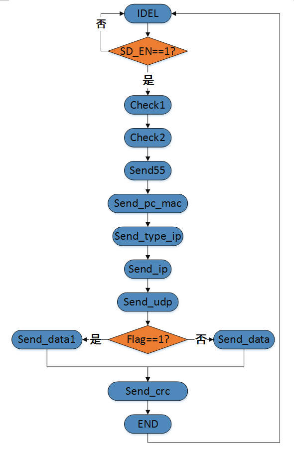 那么这里控制IDEL跳转到下一状态的SD_EN信号是什么作用呢?看下面这段代码就能知道,这个信号相当于一个选择器,当接收到的第一个字符为“3”的时候,flag信号为高,则SD_EN就一直为高电平了。SD_EN为高的时候,数据发送模就一直处于发送使能状态。而flag为低的时候,它的状态和UDP_SD_EN的状态就一样了,也就是FPGA每接收完一帧数据,便发送出一帧数据,并等待下一帧数据发送进来。