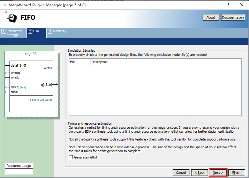 1、 打开 Tools——MegaWizard Plug-In Manager. 2、 弹出界面里默认选择第一个,创建新的宏功能模块,然后直接点击 Next。如果已经建立了IP核,想要做参数的修改,可以在这一步选择第二个选项。 3、 在Memory Complier下选择FIFO,如下图1所示。在下图中2所示位置选择FPGA类型,在3所示位置选择输出文件的命名,然后点击 Next。 4、接下来如图所示,设置FIFO的存储宽度为16bit,存储深度为256字节,类型设置为异步模式,即读写操作不使用同一个时钟信号。可以在左侧状态显示里看到当前设置的FIFO的控制信号和存储信息,核对无误后点击 Next 。 5、对FIFO进行优化类型的选择,该页面保持默认设置,直接点击 Next。 6、设置控制信号,这里勾选了写满标志位信号。FIFO 就建好了。 7、读取模式设置为预读取模式,即先读取一个数据,当rdreq有效时开始读取第二个数据。存储类型选择Auto,点击Next。 8、优化设置和仿真相关设置,参考下图设置,点击Next。 9、点击Finish,完成FIFO的构建。