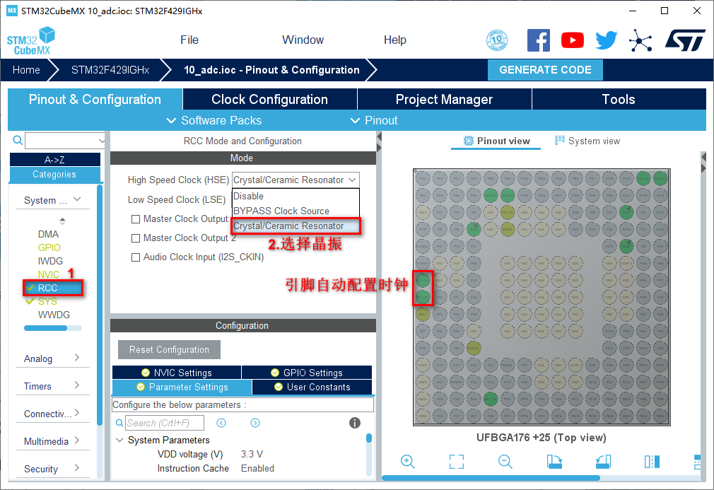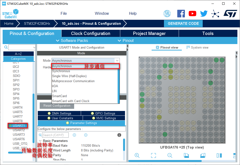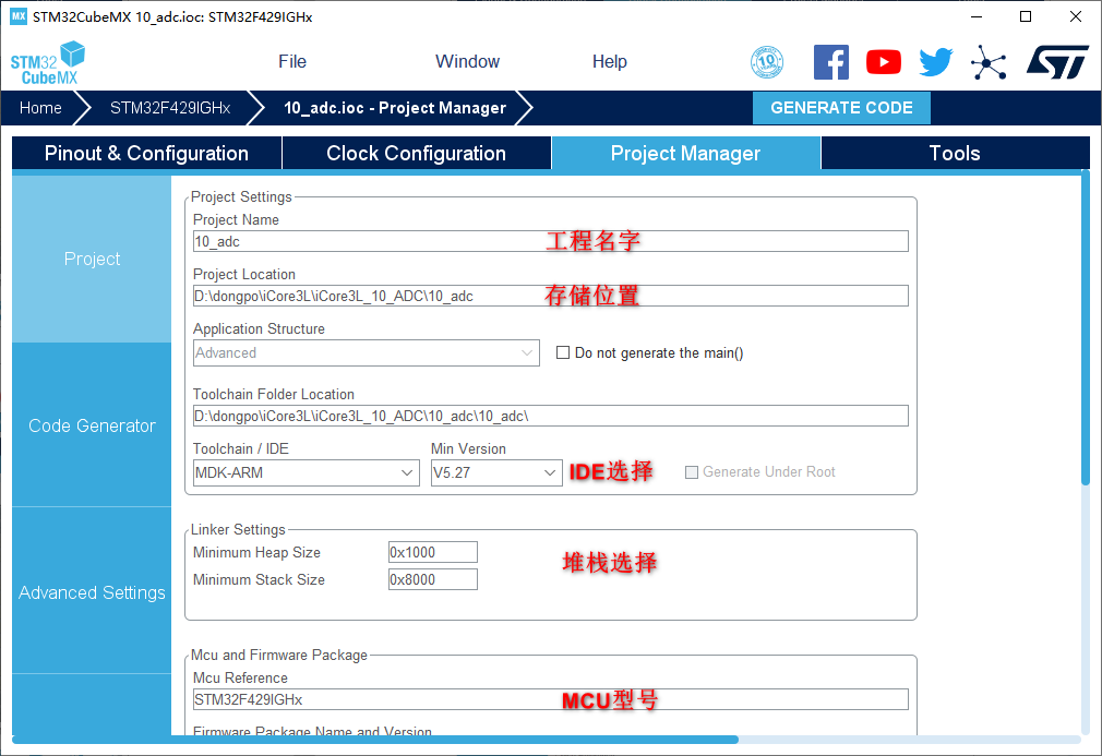 1.在主界面选择File–>New Project或者直接点击ACCEE TO MCU SELECTOR 2.出现芯片型号选择,搜索自己芯片的型号,双击型号,或者点击Start Project进入配置在搜索栏的下面,提供的各 种查找方式,可以选择芯片内核,型号等等,可以帮助你查找芯片。本实验选取的芯片型号为:STM32F429IGHx。 3.配置RCC,使用外部时钟源 4.Debug选择Serial Wire,时基源选择SysTick 5.将PI3、PI4、PH14设置为GPIO_Output 6.引脚模式配置 7.设置串口 8.在NVIC Settings一栏使能接收中断 9.配置ADC 10.时钟源设置,选择外部高速时钟源,配置为最大主频 11.工程文件的设置, 这里就是工程的各种配置我们只用到有限几个,其他的默认即可IDE我们使用的是 MDK V5.27 12.点击Code Generator,进行进一步配置