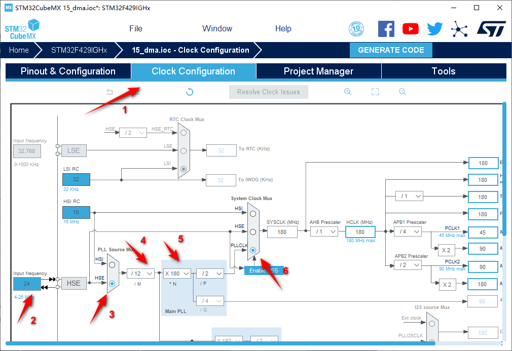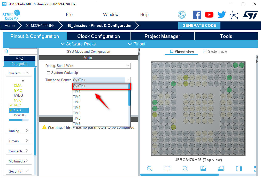 1.在主界面选择File–>New Project或者直接点击ACCEE TO MCU SELECTOR新建项目 2.出现芯片型号选择,搜索自己芯片的型号,双击型号,或者点击Start Project进入配置在搜索栏的下面,提供的各 种查找方式,可以选择芯片内核,型号等等,可以帮助你查找芯片。本实验选取的芯片型号为:STM32F429IGHx 3.使用外部时钟源 4.调试设置选择Serial Wire,时基源选择SysTick 5.分别将LEDG,LEDR,LEDB对应的引脚PI3,PI4,PH14设置为GPIO_Output 6.引脚模式配置 7.DMA配置 8.打开DMA2的中断 9.时钟源设置,选择外部高速时钟源,配置为最大主频 10.工程文件的设置, 这里就是工程的各种配置我们只用到有限几个,其他的默认即IDE我们使用的是 MDK V5.27 11.点击Code Generator,进行进一步配置