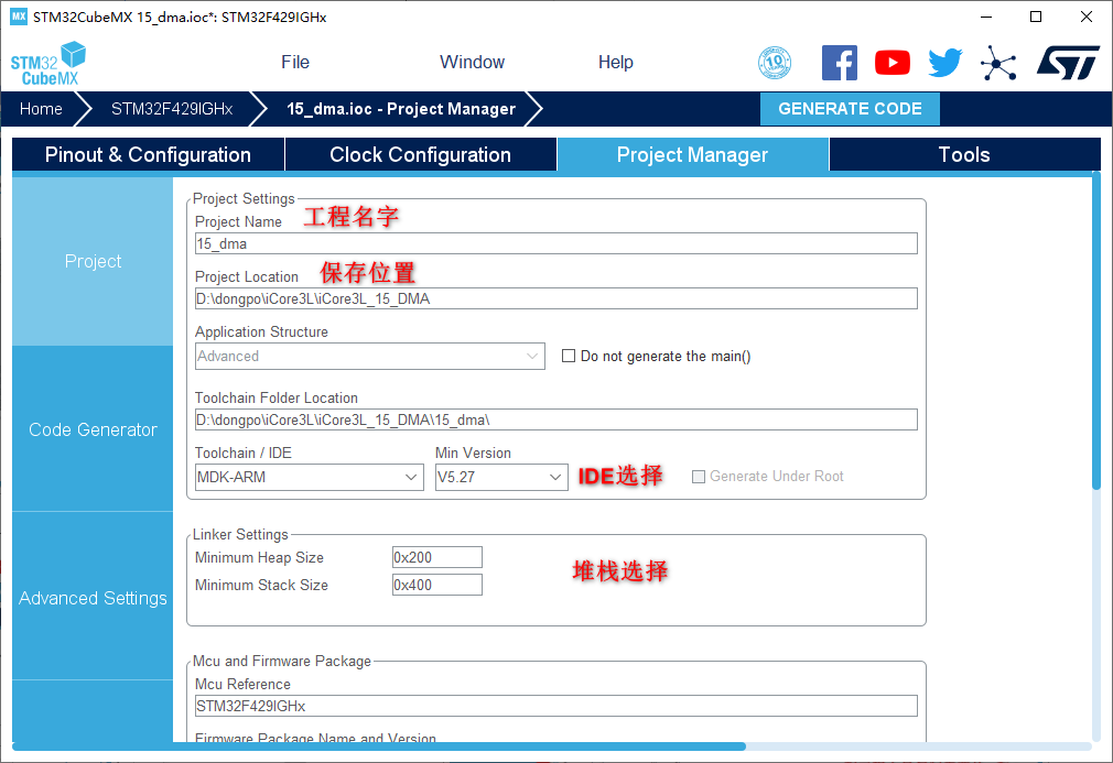 12.然后点击GENERATE CODE 创建工程 创建成功,打开工程