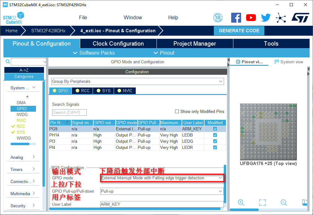 1.在主界面选择File–>New Project或者直接点击ACCEE TO MCU SELECTOR 2.出现芯片型号选择,搜索自己芯片的型号,双击型号,或者点击Start Project进入配置在搜索栏的下面,提供的各 种查找方式,可以选择芯片内核,型号等等,可以帮助你查找芯片。本实验选取的芯片型号为:STM32F429IGHx。 3.配置RCC,使用外部时钟源 4.Debug选择Serial Wire,时基源选择SysTick 5.将PI3、PI4、PH14设置为GPIO_Output 6.将ARM_KEY对应的引脚PG9设置为GPIO_EXTI9 7.引脚模式配置 8.设置NVIC(嵌套向量中断控制器) 9.时钟源设置,选择外部高速时钟源,配置为最大主频 10.工程文件的设置, 这里就是工程的各种配置 我们只用到有限几个,其他的默认即可IDE我们使用的是 MDK V5.27 11.点击Code Generator,进行进一步配置