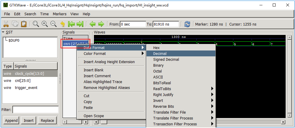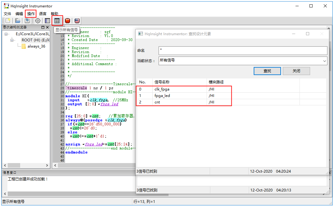 7、用户在选择好各种信号后, 需要点击”保存工程”菜单项或者相应按钮, 对工程进行保存。 实际上, 只要用户对工程做了任何改变,都需要保存工程, 这样 HqInsight 才能根据用户的设置生成调试需要的 IP 核及中间配置文件。