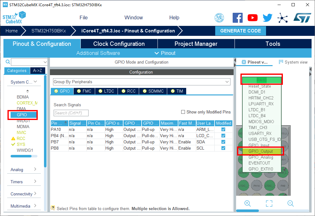 5.将PA10,PB7,PB8,PI1,PI2,PI3设置为GPIO_Output