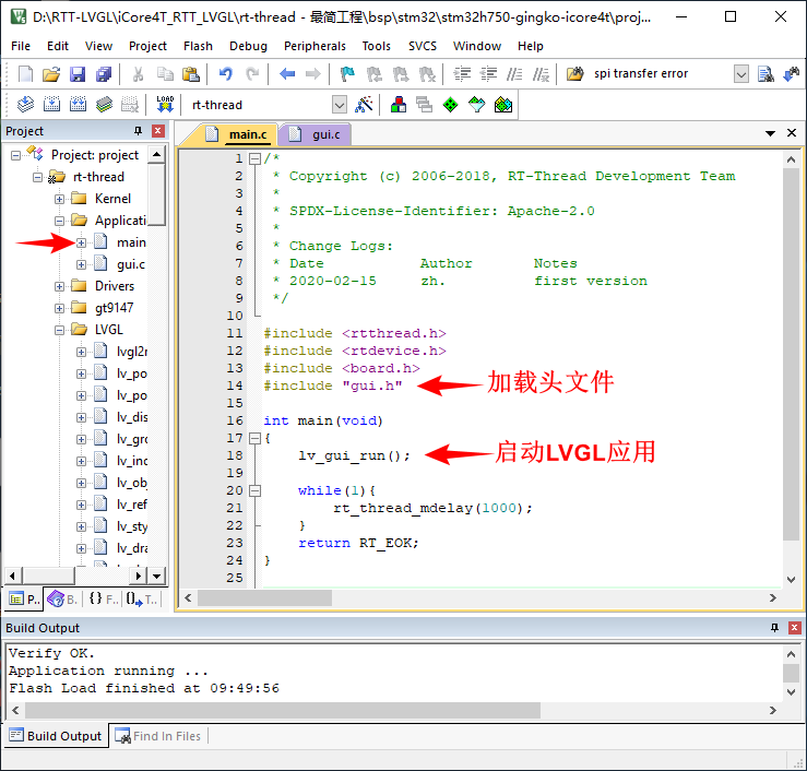 RT-Thread开机初始化完成后,会创建main线程,我们在main中调用lv_gui_run()函数启动LVGL应用,用户也可根据需求在其他线程中调用。