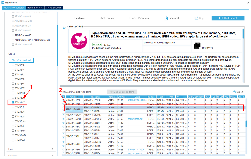 2. 出现芯片型号选择,搜索自己芯片的型号,双击型号,或者点击Start Project进入配置在搜索栏的下面,提供的各种查找方式,可以选择芯片内核,型号,等等,可以帮助你查找芯片。本实验选取的芯片型号为:STM32H750IBKx。