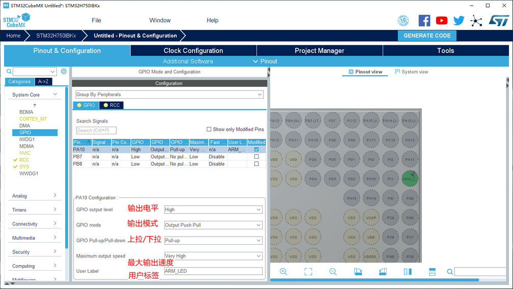 5. 将PA10,PB7,PB8设置为GPIO_Output