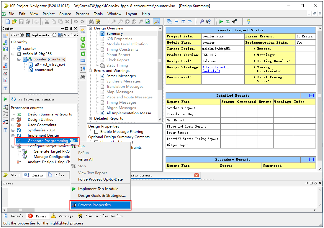 1、打开ISE工程,以实验八工程为例,右键点击Generate Programming FileProcess Properties…。