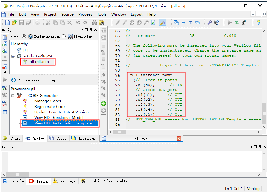 11、 可以看到工程目录里已经添加了PLL IP核文件,点击选中PLL IP核文件,再双击CORE Generator下的View HDL Instantiationtemplate,可以在编辑区看到PLL IP核的例化模板。