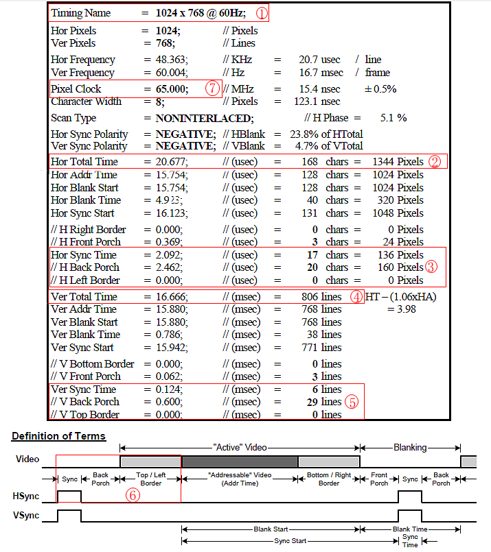 VESA_VGA时序标准中关于1024 * 768@60Hz分辨率显示器接口时序定义如下所示: