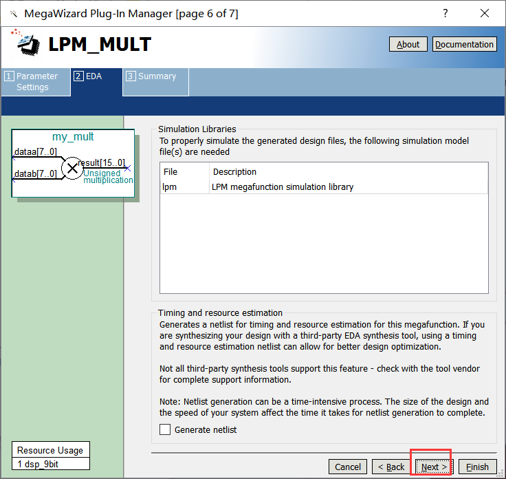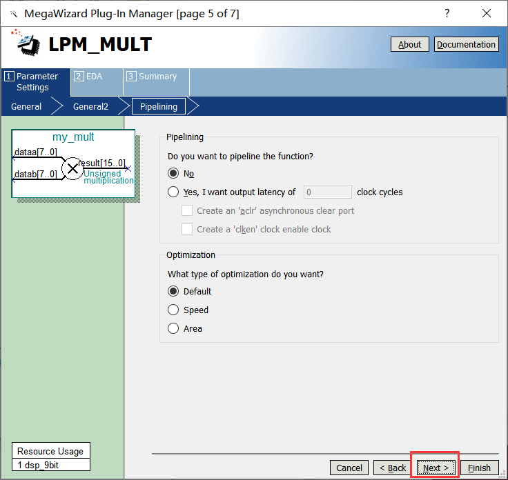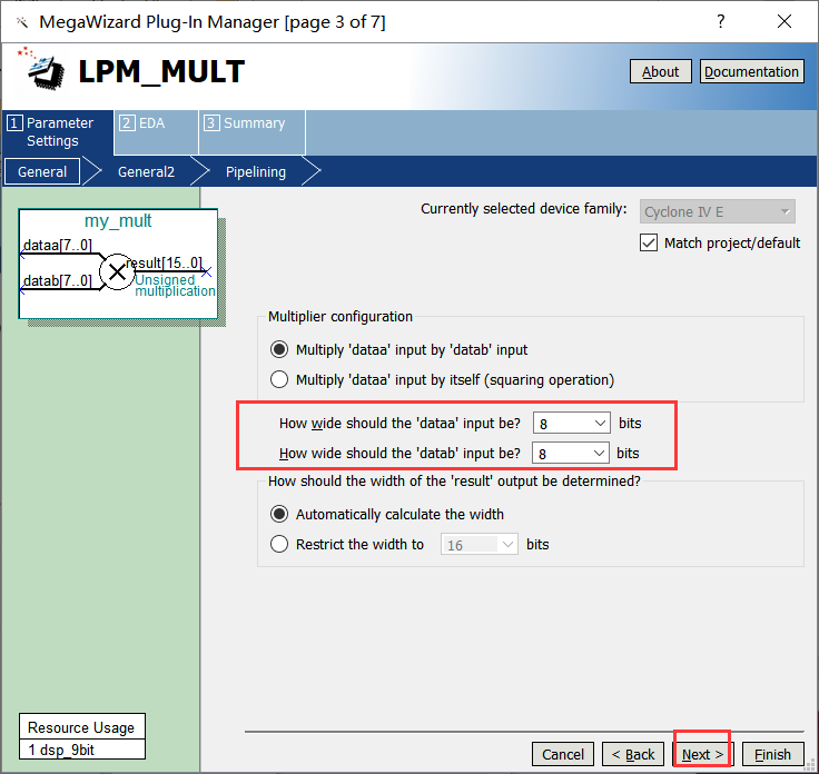 4、在框1处选择乘法器输入数据的宽度,此处以8位宽度为例,如下图所示,然后点击Next。