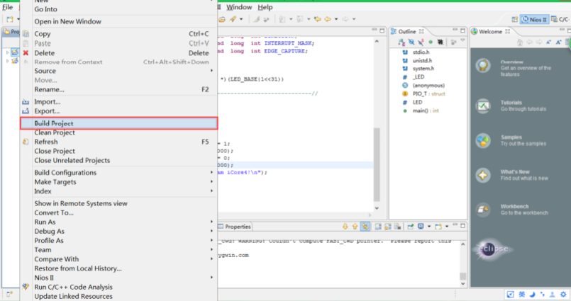 8、右击led选择Run As…→3Nios II Hardware,如图所示: