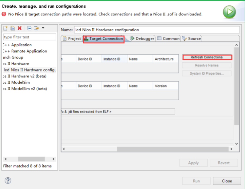 9、可能出现如下窗口,在Target Connection中点击Refresh Connections.