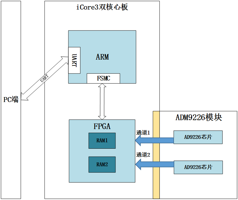 本实验基于ARM+FPGA的双核心系统。实验目的可以分为两个,一是FPGA将AD9226芯片转换后的数字信号采集并存储到内部RAM存储器。二是 ARM读取FPGA内部RAM中的数据,并上传至PC。