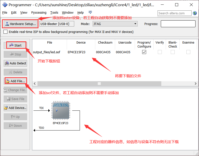 (1)右击我的电脑,进入设备管理器,找到USB-Blaster(带叹号),如图0-17所示。 图0-17 (2)右击USB-Blaster,点击更新驱动程序,出现下面对话框,如图0-18所示。 图0-18 (3)选择浏览我的计算机,出现下面对话框,选择驱动程序路径,此处选择路径为 F:\altera\13.1\quartus,如图0-19所示。 图0-18 (4)点击下一步开始,更新,中间会出现是否安装对话框,选择安装,如图0-20所示。 图0-19 (5)安装成功会出现下面对话框,如图0-21所示。 图0-20 (6)进入设备管理器查看安装成功,叹号消失,如图0-22所示。 图0-21