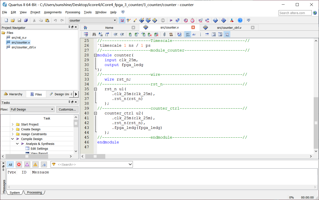 本实验例程同样分为三个模块,这里不再一一讲解,只讲解最关键的计数器控制led灯模块。