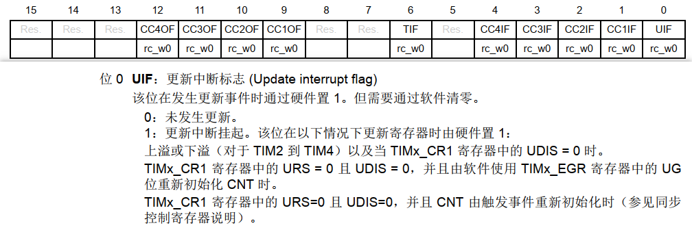 • (5)状态寄存器(TIMx_SR),该寄存器用来标记当前与定时器相关的各种事件/中断是否发生。该寄存器的各位描述如图所示: