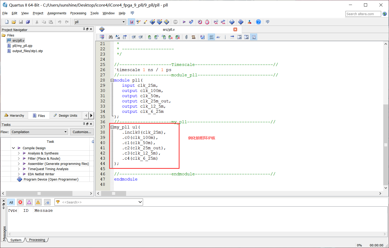 • FPGA内部锁相环的工作原理主要是通过调用内部IP核,改变IP核内部分频、倍频及相位差等参数,以此改变输入参考时钟的输出频率核相位,从而达到用户所需要的时钟信号驱动程序的运行。