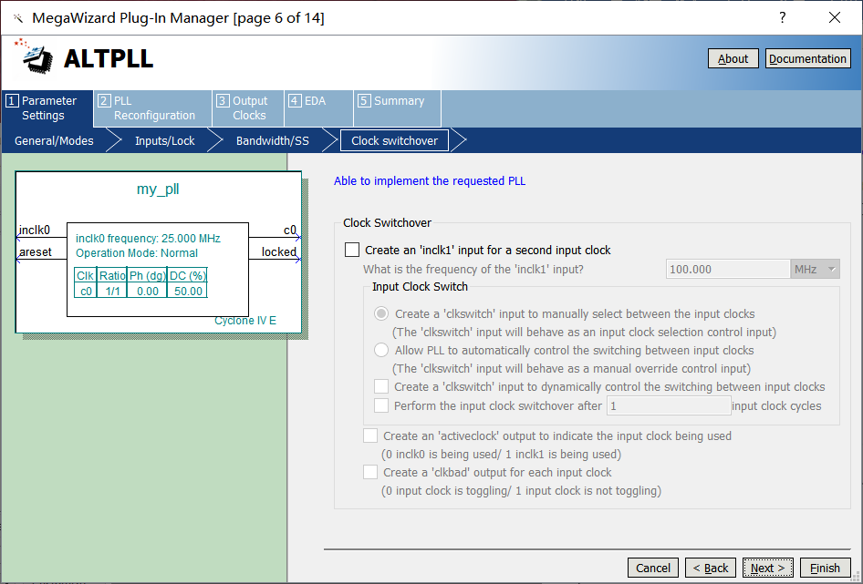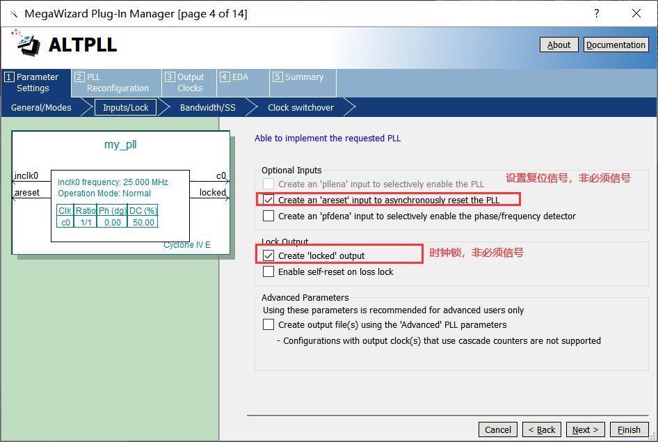 1、新建一个工程名为pll的工程,然后点击Tool →Megawizard Plug-In Manager,如图9-1所示。 图9-1 2、在该对话框选择新建IP核,如图9-2所示。 图9-2 3、在此对话框选择新建IP核类型、生成的硬件描述语言、IP核文件的存储位置,如图9-3所示。 图9-3 4、在此对话框中设置速度等级和输入时钟大小,设备芯片的速度等级是8,输入参考时钟是25MHz,如图9-4所示。 图9-4 5、添加时钟复位信号和时钟锁,两个都是非必须信号,一般不需要添加,如图9-5示。 图9-5 6、该对话框直接默认设置即可,如图9-6所示。 图9-6 7、该对话框直接默认设置即可,如图9-7所示。 图9-7 8、该对话框直接默认设置即可,如图9-8所示。 图9-8 9、设置第一个输出时钟100MHz,由25MHz输入时钟进行4倍频得到的,输出时钟相位差为0,占空比为50%,设置参数如图9-9所示。 图9-9 10、输出第二路时钟信号50MHz,设置参数如图9-10所示。 图9-10 11、输出第三路时钟信号25MHz,设置参数如图9-11示。 图9-11 12、输出第四路时钟信号12.5MHz,设置参数如图9-12所示。 图9-12 13、输出第五路时钟信号6.25MHz,设置参数如图9-13所示。 图9-13 14、在该对话框一般默认设置即可,如图9-14所示。 图9-14 15、选择要生成的IP核文件信息,一般默认即可,如图9-15所示。 图9-15 16、点击Finish后弹出该对话框,在此一定选择Yes,如图9-16所示。 图9-16 17、在工程中新建pll.v文件,并对锁相环IP核进行例化,如图9-17所示。 图9-17 18、程序编写完成后进行编译即可,此时锁相环调用完成。