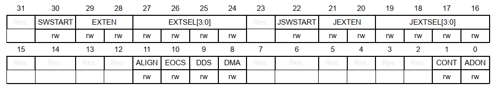 • ADC_CR2寄存器的各位描述如图所示: