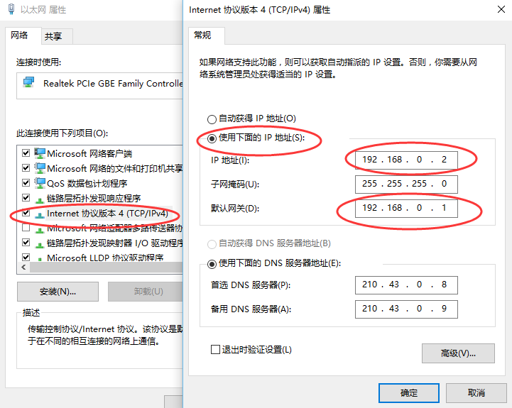 1、打开控制面板→网络和Internet→网络和共享中心→更改适配器设置→以太网→属性 2、Internet协议版本4→选择使用下面的IP地址(如下图所示),然后更改IP地址和默认网关