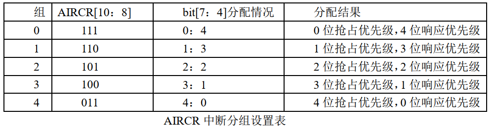 AIRCR 中断分组设置表