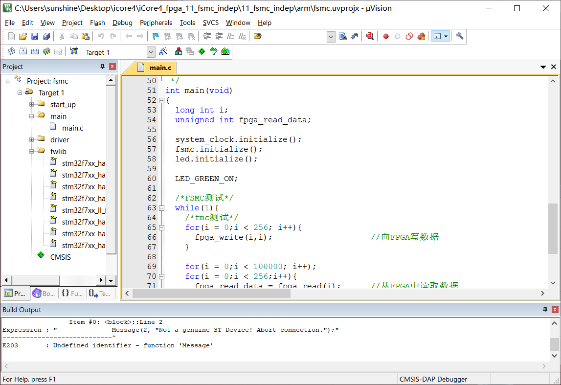 5、打开本实验所带keil工程文件,如下图所示。 图11-5 图11-6 6、点击图11-7红框中的按钮将程序烧写进iCore4上的STM32中。 图11-7