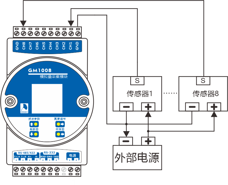 模块内置高性能电源变换电路﹐供电电压范围宽至7.5V~36V且效率高达90%以上。此特性为长时间使用的电源稳定性提供保障。模块内置电源隔离,使得供电输入、模拟测量通道及通信接口三者之间相互隔离,ADC采用低噪声电源供电,此特性为测量精度,模块稳定性及通用性提供保证。