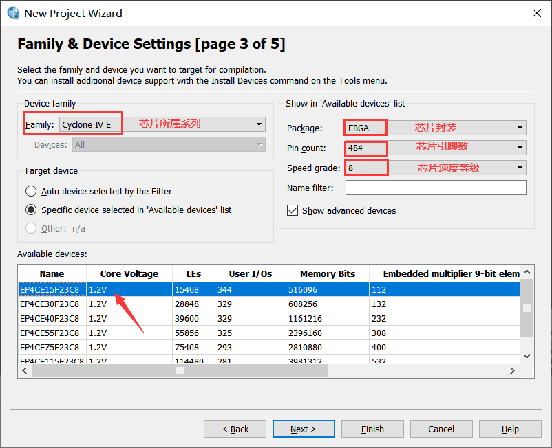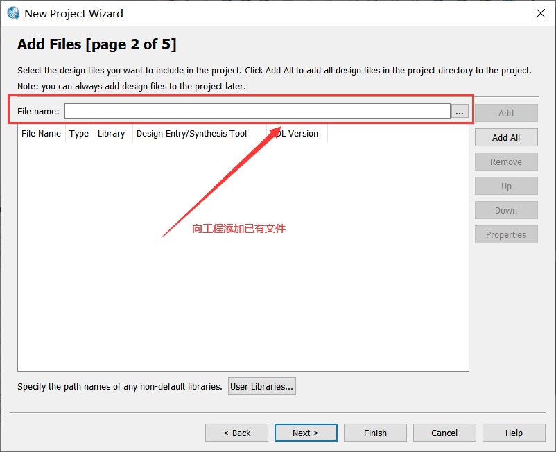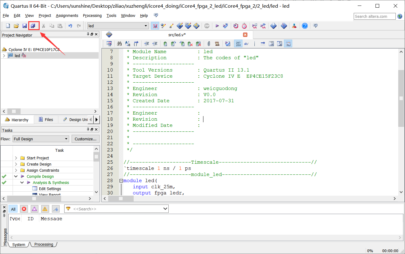 1、双击Quartus桌面图标打开软件,出现下面界面,如图1-2所示。 图1-2 2、点击新建图标出现下面对话框,选择New Quartus II Project选项,如图1-3所示。 图1-3 3、直接点击Next,如图1-4所示。 图1-4 4、在此界面选择工程存放的路径,设置工程名及顶层文件名称,如图1-5所示。 图1-5 5、此界面主要用来添加已经编辑好的模块文件,若没有直接下一步即可,如图1-6所示。 图1-6 6、选择设备所用的芯片型号,芯片的系列、封装、引脚数、速度等级的选项方便用户更快速精确的找到目标芯片的型号,如图1-7所示。 图1-7 7、进行仿真器的一些设置,可忽略,如图1-8所示。 图1-8 8、至此,工程建立完成,如图1-9所示。 图1-9 9、回到软件主界面可以看到新建的工程已经显示在左边列表中,如图1-10所示。 图1-10 10、重新点击新建图标进入下面界面选择将要编译的文件类型,此处选择Verilog HDL硬件语言描述类型,如图1-11所示。 图1-11 11、一个新的文件就建好了,此时文件时空的,点击file→save as保存文件。常将源文件保存在src文件夹下,且文件名称必须与模块名称一致,如图1-12所示。 图1-12 12、此时就可以写代码了,写好以后点击方框处的全部保存,如图1-13。 图1-13 13、点击assignments→device,出现下边窗口,再点击方框处的“devices and pin options”,在弹出的窗口左栏中选择箭头1所示的“unused pins”,在相应的右边栏红框处的下拉菜单中选择“as input ti-stated”。 图1-14 图1-15 图1-16 14、然后在左边栏中选择”Dual-purpose pins”,在相应的右边栏中双击图示位置会出现下拉菜单,选择”use as regular I/O”。 图1-17 15、这是选择好的界面,点击OK即可。 图1-18 16、点击图示方框中的按钮进行编译。 图1-19 17.编译完成后,点击Assignment→pin planner或直接点击图1-20方框中的按钮,进行引脚分配。 图1-20 18、在引脚分配窗口下方的列表中显示工程的输入输出引脚,双击location栏下(箭头指示的位置)会出现下拉菜单,根据自己的硬件连接,选择正确的引脚,完成之后关闭窗口即可。 图1-21 图1-22 图1-23 19、接下来再次编译程序,点击processing→start compilation或者直接点击图1-24小方框中的图标。可以在图1-25左侧看到编译进度,图示是编译完成的状态,右侧方框处是生成的报告(工程占用的资源数及引脚数等信息)。 图1-24 图1-25 20、按照上一实验中介绍的配置文件下载教程将配置文件下载至硬件,观察实验现象。