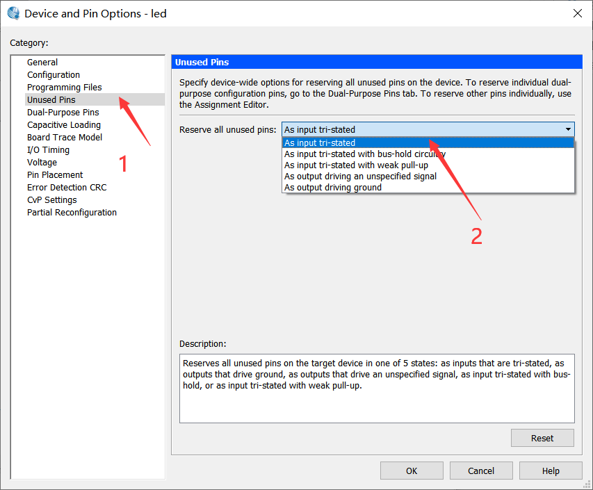 13、点击assignments→device,出现下边窗口,再点击方框处的“devices and pin options”,在弹出的窗口左栏中选择箭头1所示的“unused pins”,在相应的右边栏红框处的下拉菜单中选择“as input ti-stated”。
