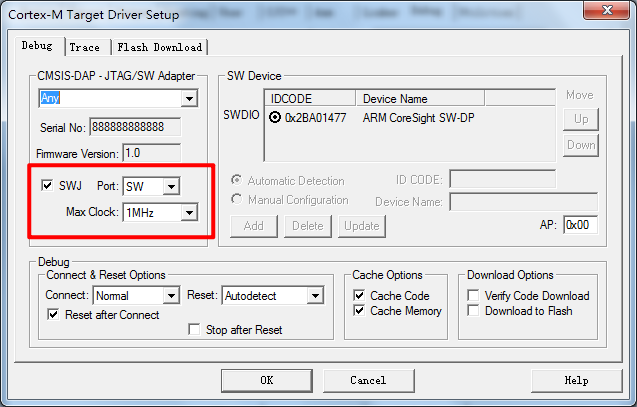 CMSIS-DAP支持JTAG和SWD,同时STM32也支持JTAG和SWD。所以,我们有2种方式可以用来调试,JTAG调试的时候,占用的IO线比较多,而SW调试的时候占用的IO线很少,只需要两根即可。这里我们采用SWD调试。