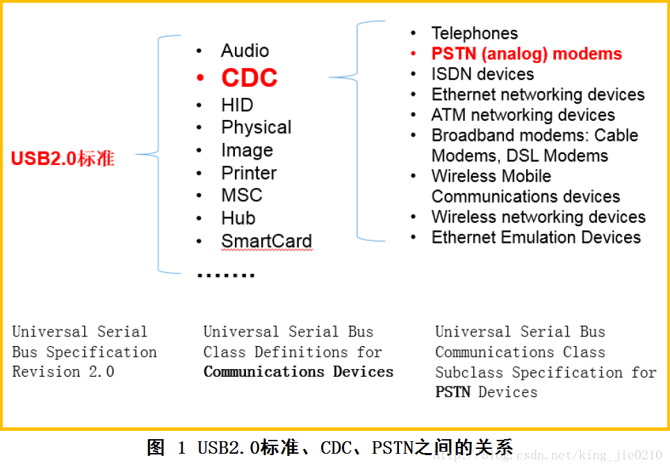 USB2.0标准下定义了很多子类,有音频类,CDC类,HID,打印,大容量存储类,HUB,智能卡等等,这些在usb.org官网上有具体的定义,这里主要介绍通信类CDC。CDC(Communication Device Class)类是USB2.0标准下的一个子类,定义了通信相关设备的抽象集合。它与USB2.0标准以及其下的子类的相互关系如下图所示: