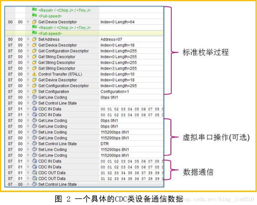 USB CDC类的通信部分主要包含三部分:枚举过程、虚拟串口操作和数据通信。其中虚拟串口操作部分并不一定强制需要,因为若跳过这些虚拟串口的操作,实际上USB依然是可以通信的,这也就是为什么下图中,在操作虚拟串口之前会有两条数据通信的数据。之所以会有虚拟串口操作,主要是我们通常使用PC作为Host端,在PC端使用一个串口工具来与其进行通信,PC端的对应驱动将其虚拟成一个普通串口,这样一来,可以方便PC端软件通过操作串口的方式来与其进行通信,但实际上,Host端与Device端物理上是通过USB总线来进行通信的,与串口没有关系,这一虚拟化过程,起决定性作用的是对应驱动,包含如何将每一条具体的虚拟串口操作对应到实际上的USB操作。需要注意的是,Host端与Device端的USB通信速率并不受所谓的串口波特率影响,它就是标准的USB2.0全速(12Mbps)速度,实际速率取决于总线的实际使用率、驱动访问USB外设有效速率(两边)以及外部环境对通信本身造成的干扰率等因素组成。