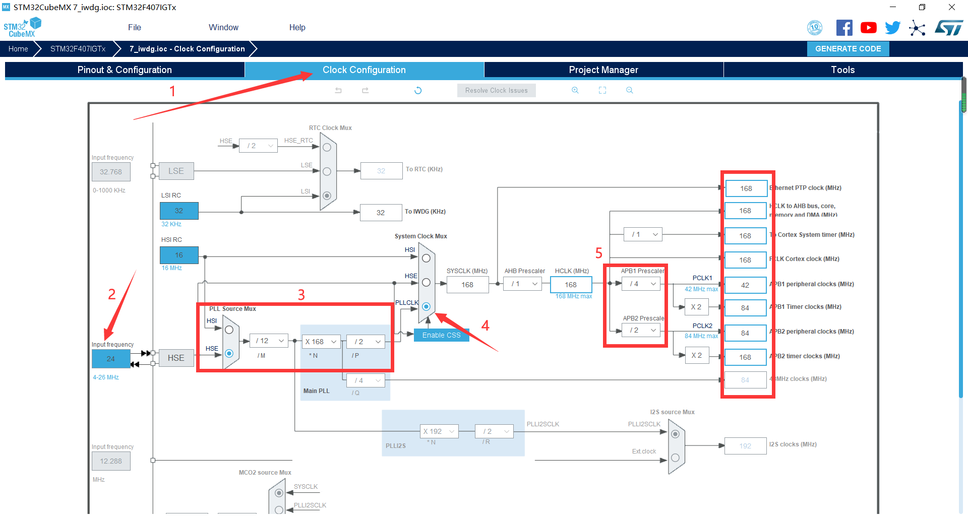 8. 配置IWDG  9. 时钟源设置,选择外部高速时钟源,配置为最大主频  10. 工程文件的设置, 这里就是工程的各种配置 我们只用到有限几个,其他的默认即可 IDE我们使用的是 MDK5  11. 点击Code Generator,进行进一步配置