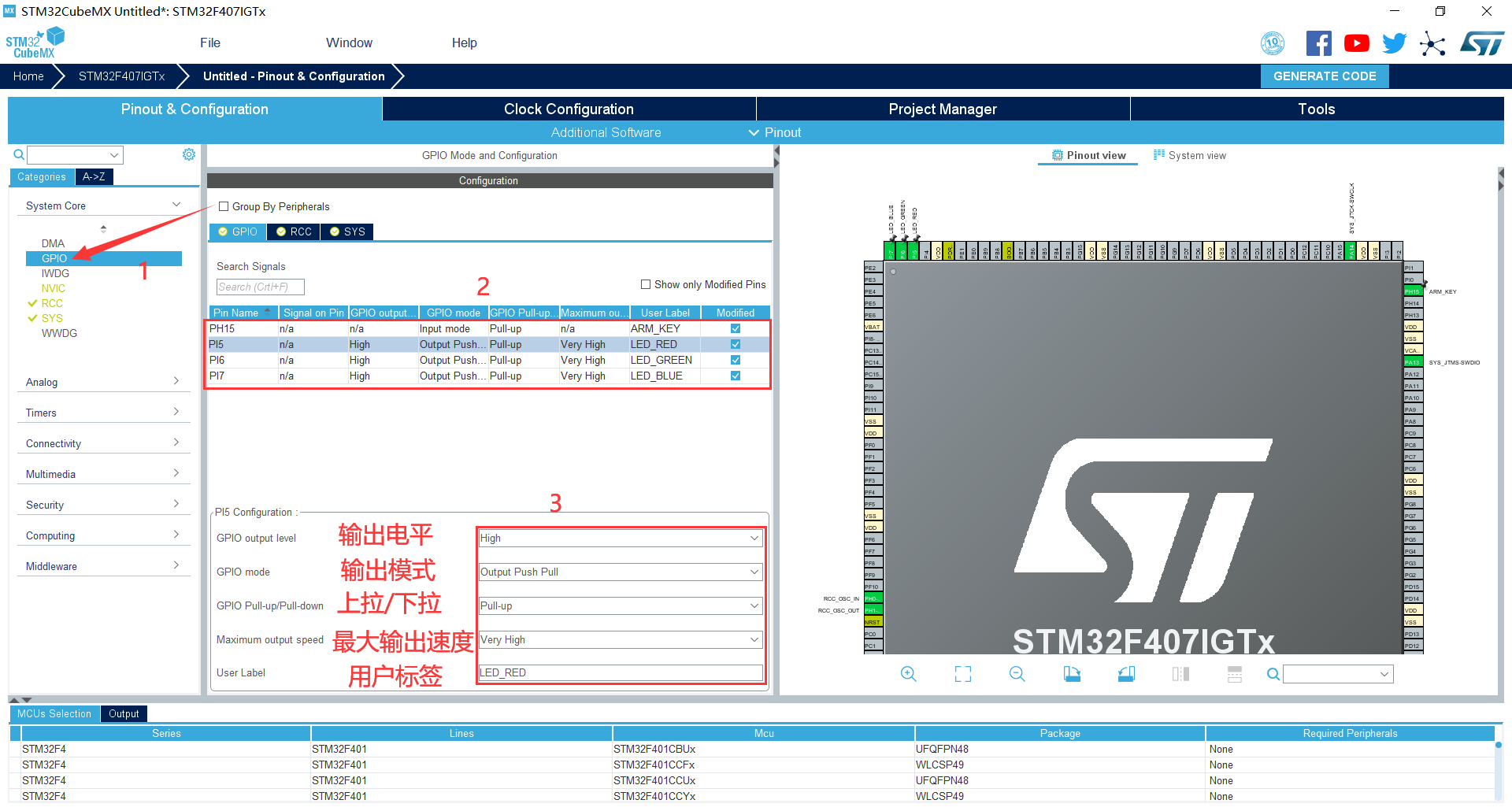 3. 配置RCC,使用外部时钟源  4. 配置调试引脚  5. 将LED对应的3个引脚(PI5,PI6,PI7)设置为GPIO_Output  6. 将ARM_KEY对应的引脚(PH15)设置为GPIO_EXTI15  7. 引脚模式配置