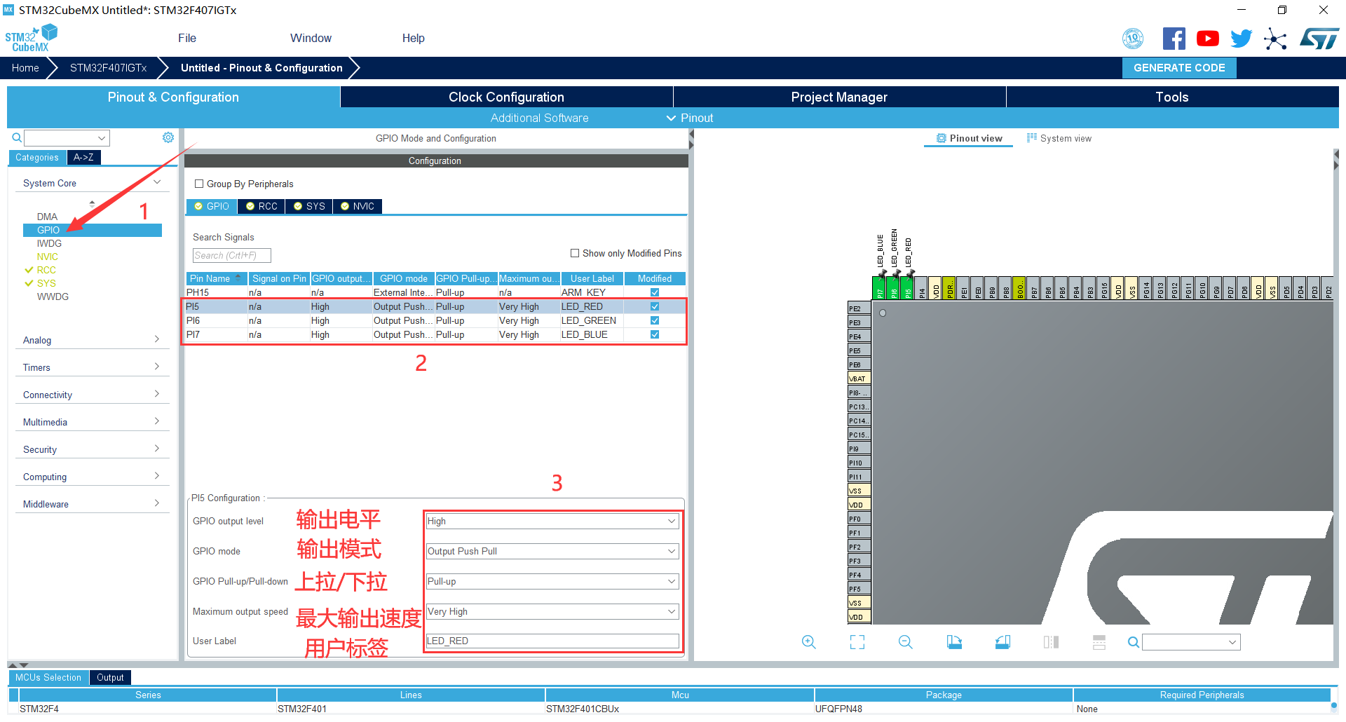 5. 将LED对应的3个引脚(PI5,PI6,PI7)设置为GPIO_Output