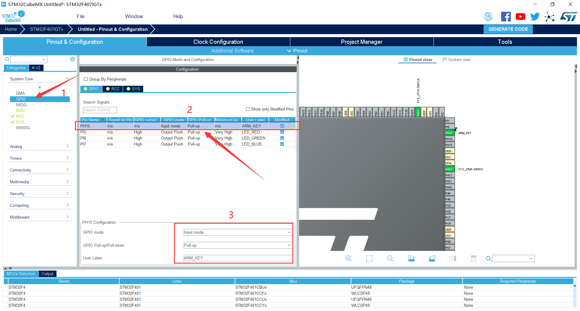 6. 将ARM_KEY对应的引脚(PH15)设置为GPIO_Input