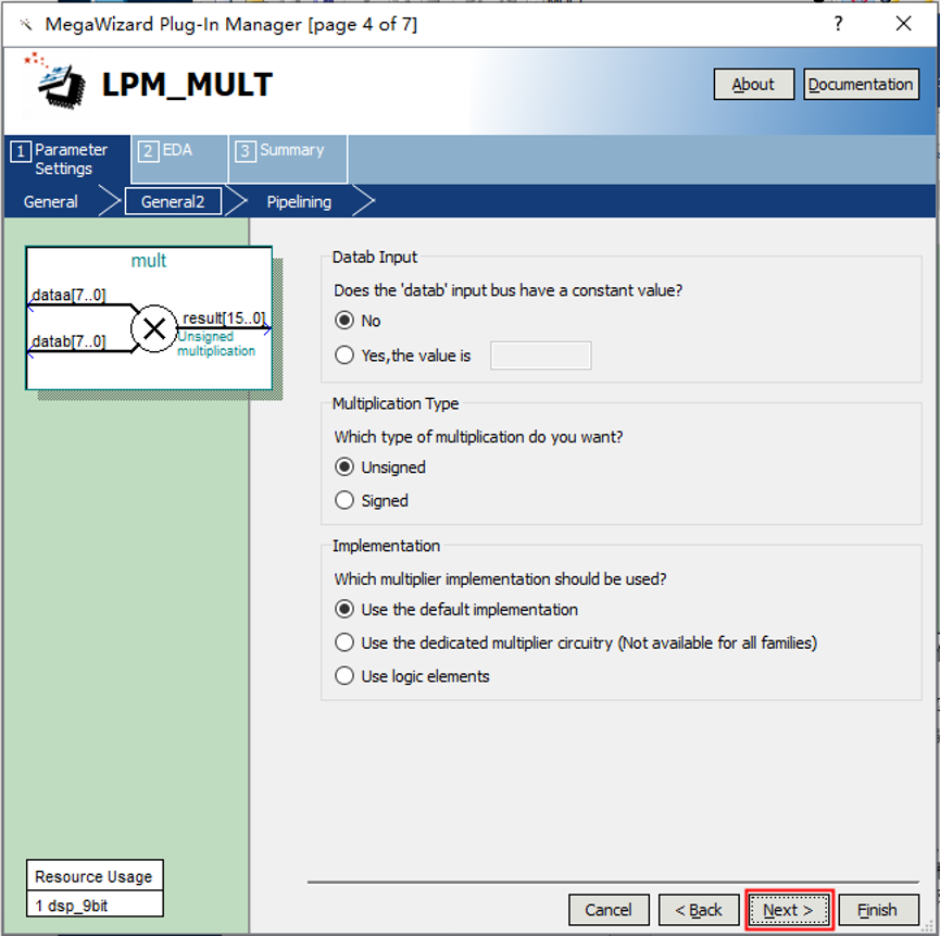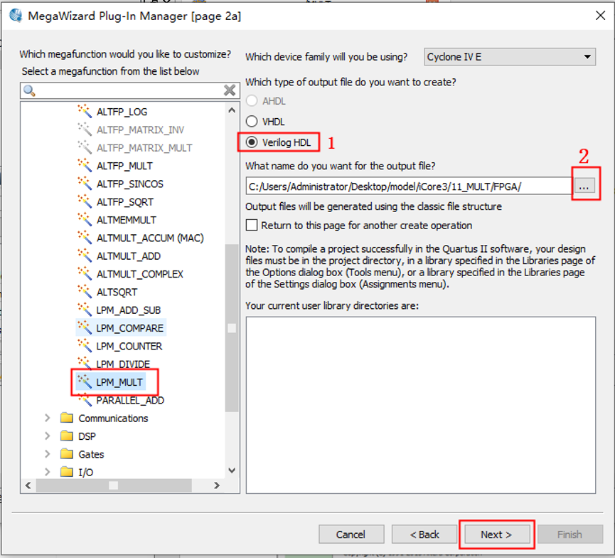 1、建立工程,并新建 MULT.v 文件。打开 Tool→MegawizardPlug-In Manager。 2、直接点第一个新建 MULT,点击 Next。 3、在左侧的栏里 Arithmetic 文件夹下找到并选中 LPM_MULT,在框 1 处选择 Verilog HDL,再点击框 2 中按钮选择文件存放目录,然后点击图中 Next。 4、框 1 处选择乘法器输入数据的宽度,此处以 8 位宽度为例,然后点击 Next。 5、接下来几页保持默认设置直接点击 Next,最后点击 Finish 即可。 6、接着把代码写进工程,分配引脚(使用接到排针的引脚,避免跟其他芯片引脚信号 冲突烧坏芯片),编译即可。 7、 打开逻辑分析仪将输出信号加入波形列表观察波形信号是否正确。