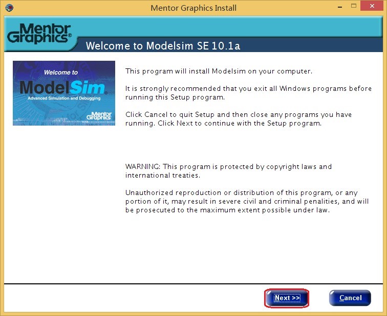 1、双击 modelsim-win32-10.1a-se.exe 文件开始安装。