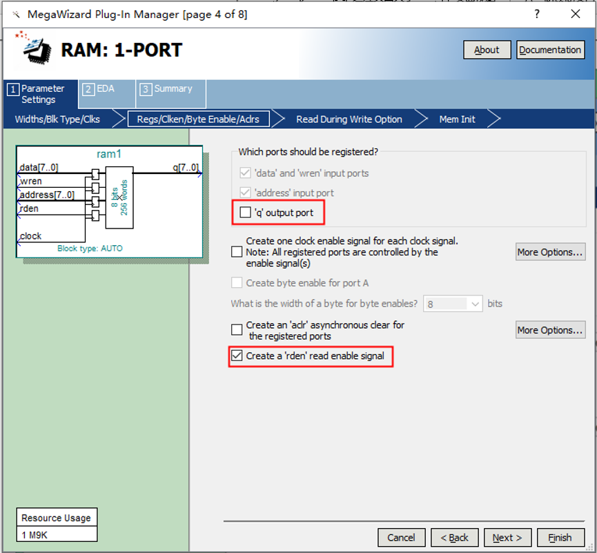 3、 在方框 1、方框 2、方框 3 处如图所示做选择,在方框 4 处选择 RAM 块的路径及命 名,然后点击 Next.