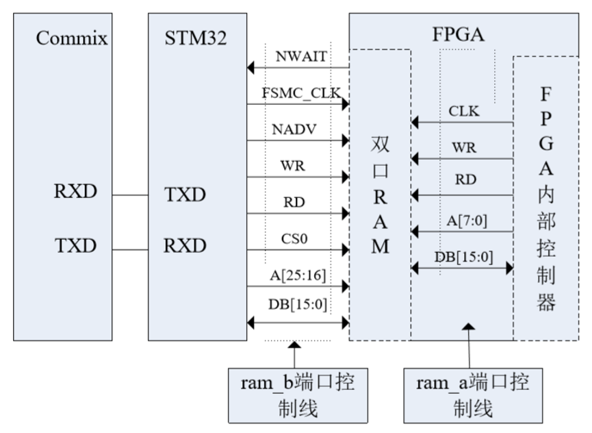• 由于双口RAM有两条相互独立的地址线、数据线和控制线,能实现数据共享,本实验针对双口 RAM 的工作特点进行实验验证。实验中通过 FPGA 对 RAM 的 A 端口进行读写操作,RAM的A端口先向RAM中写入0到255的数据,然后再读出来,如此循环操作。同时,通过 Commix 向 STM32 发送读命令,STM32收到命令后,通过STM32F407的 FSMC总线实现与FPGA通信,对RAM的 B 端口进行读控制,发送一次读命令RAM的 B 端口把相应地址里面的数据发送至 ARM,再发送至 Commix 显示出来以验证实验的成功性。 在本实验中实现了双口 RAM 的两种工作模式:1、双口 RAM 一个端口写操作,另一个端口 读操作;2、双口 RAM 两个端口同时读操作。实验的原理如下图 1 所示。