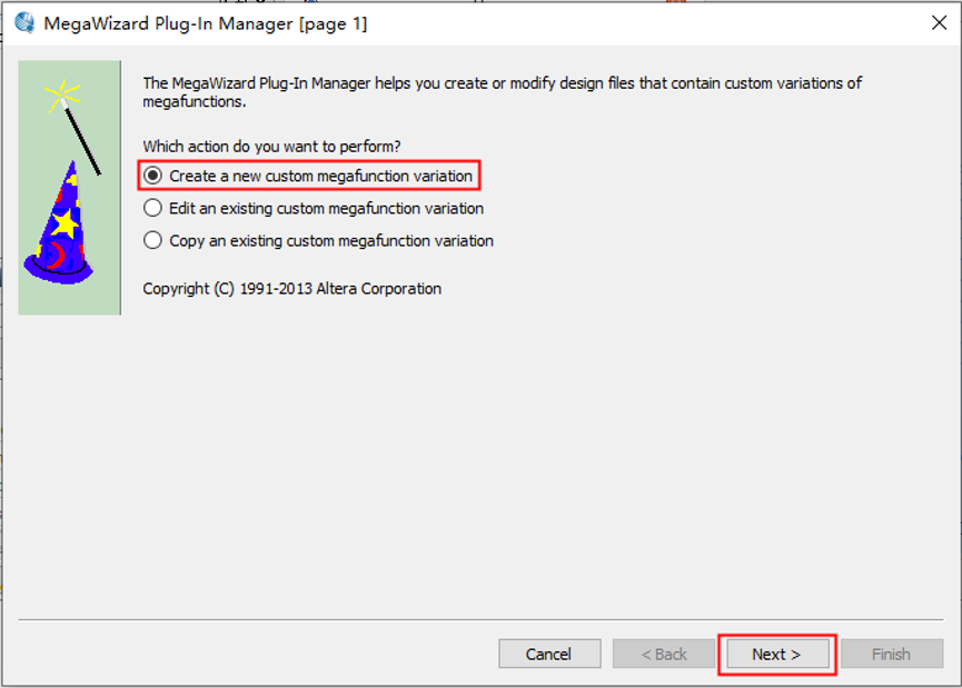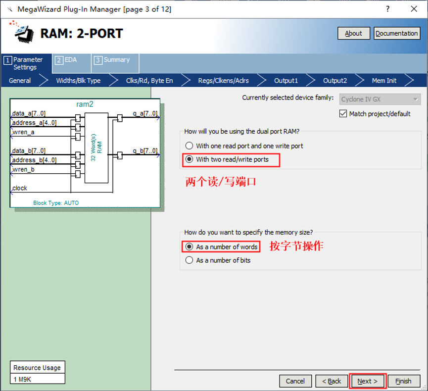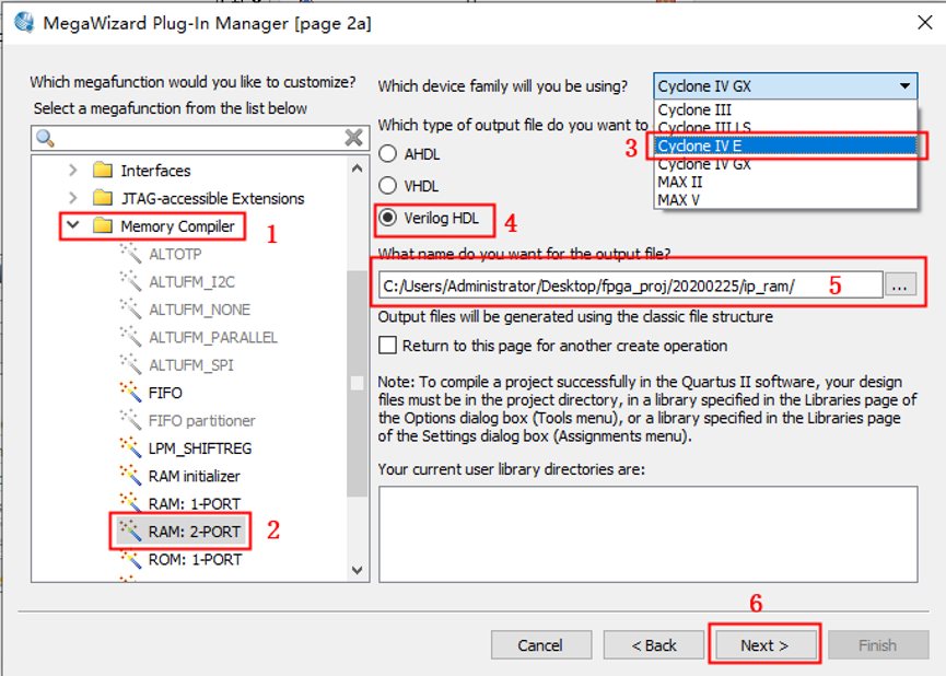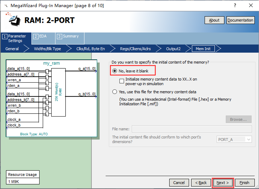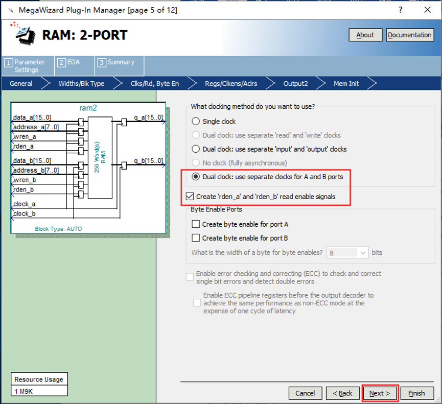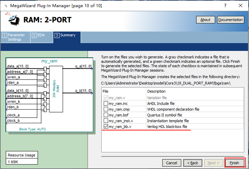 1、 打开 Tools——MegaWizard Plug-In Manager. 图1 2、创建IP核,点击next。 图2 3、在弹出界面1存储器列表里选择2双口RAM。3处选择FPGA类型。4处选择输出文件语言类型。5处设置文件存储位置和命名。点击6处next进行下一项设置。 图3 4、设置如下 图4 5、设置存储器深度为256,输出总线宽度16bit,使用FPGA逻辑资源类型选择自动分配。点击next。 图5 6、配置端口时钟和读使能信号。 图6 7、注意红框中不打勾,点击Next, 图7 8、后面几项保持默认设置,直接点击Next,最后点击Finish,双口RAM就构建好了。注意:在存储内容初始化选项设置里选择保持空白,因为本实验是要向双口RAM中写入数据再读出数据并进行对比的操作,不需要在存储器内预装数据。 图8 图9 图10 图11