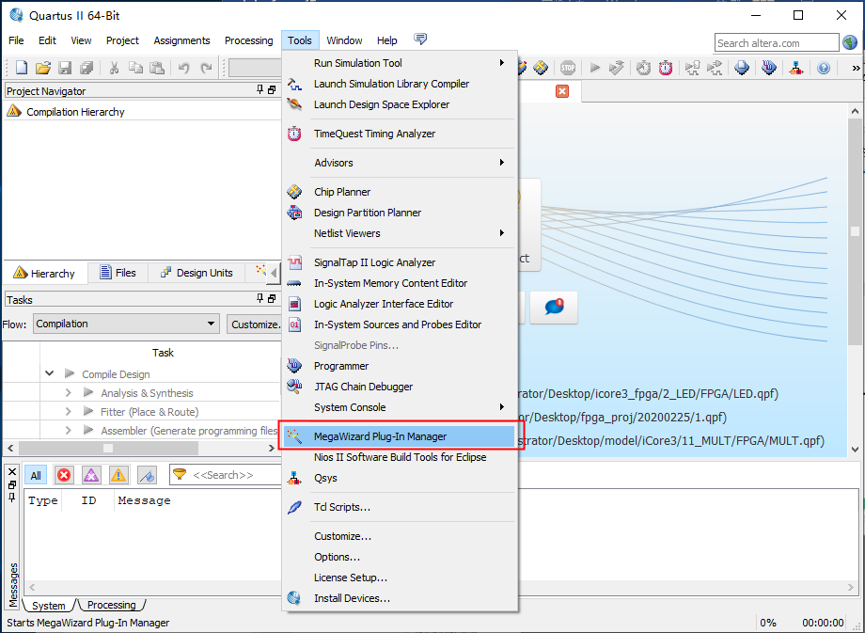 6. 打开 Quartus II 开发环境,并打开实验工程;