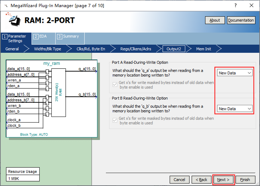 • 模式1:由FPGA控制,先通过A端口向RAM中写入256个数据,然后读出来,循环操作。这是对A端口的独立读写操作。
