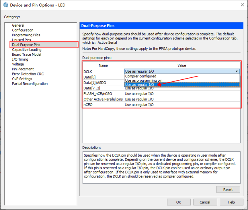 9. 一个新的文件就建立好了,此时文件是空的,点击 file→save as 保存文件(如图箭 头所指),在弹出的窗口中找到你新建工程的路径,选择源文件文件要存放的文件夹(已经提前新建好 “src”文件夹,这里直接选择此文件夹,大家可以自行建立),选择好保存地址后,在箭头处填写合适的文件名称,我这里命名为“led.v”,点击打开。在工作界面箭头处可以看见改好名称的文件。 10. 此时可以写代码了,写好以后点击方框处的全部保存。 11. 点击 assignments→device,出现下边窗口,再点击方框处的 “device and pin options”, 在弹出的窗口左边栏中选择箭头 1 所示的 “unused pins”,在相应的右边栏红框处的 下拉菜单中选择 “as input ti-stated”,将未使用引脚配置为三态输入模式。 12. 然后在左边栏中选择“Dual-purpose pins”,在相应的右边栏中双击图示位置会出现下拉菜单,选择“use as regular I/O”。 13. 这是选择好的界面,点击 OK 即可。
