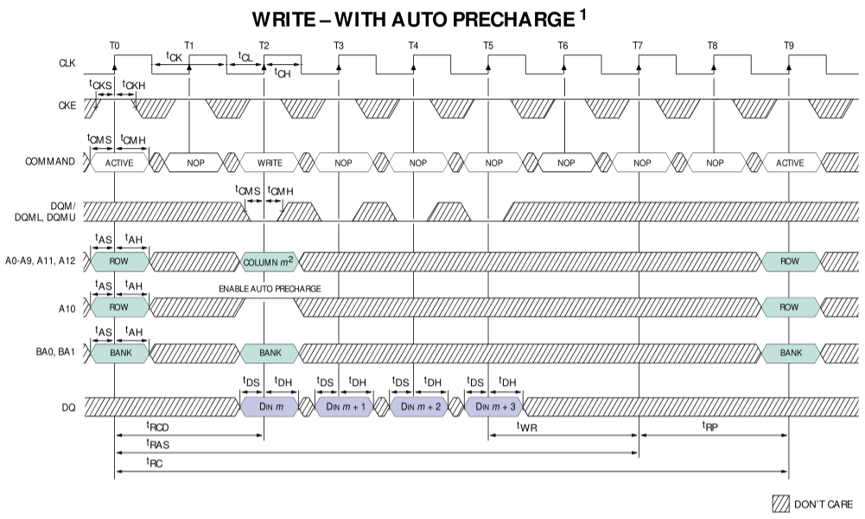 //--------------------Work_FSM-------------------------------// reg [2:0] Work_State_r = 3'd0;//工作状态寄存器 reg [8:0] cnt_clk_w = 9'd0;//工作状态时钟计数器 reg wr_sig; always @(posedge SDRAM_CLK or negedge RST_n) if (!RST_n) Work_State_r <= `Work_IDLE;//上电复位处于IDLE状态 else case (Work_State_r) `Work_IDLE: begin cnt_clk_w <= 9'd0; if (SD_Init_Done && SD_RD_Req) //初始化完成且 Work_State_r <= `Work_ACT_RD; //有读请求,进入读ACT状态 else if (SD_Init_Done && SD_WR_Req) //有写请求,进入写ACT状态 Work_State_r <= `Work_ACT_WR; else if (SD_Init_Done && REF_Req) //初始化完成且有刷新请求 Work_State_r <= `Work_AR; //进入刷新状态 else Work_State_r <= `Work_IDLE; end `Work_ACT_RD: begin if (cnt_clk_w == 9'd3)//ACT占用3个周期 begin cnt_clk_w <= 9'd0; //时钟计数器清零 Work_State_r <= `Work_RD; //根据读写信号 end //决定是进入WR状态还是RD状态 else begin cnt_clk_w <= cnt_clk_w + 1'd1; //自加1 Work_State_r <= `Work_ACT_RD; end end `Work_ACT_WR: begin if (cnt_clk_w == 9'd2) //ACT占用3个周期 begin cnt_clk_w <= 9'd0; //时钟计数器清零 Work_State_r <= `Work_WR; //根据读写信号 end //决定是进入WR状态还是RD状态 else begin cnt_clk_w <= cnt_clk_w + 1'd1;//自加1 Work_State_r <= `Work_ACT_WR; end end `Work_WR: begin//写状态 if (cnt_clk_w == 9'd258) //写状态占用258个周期,发送写命令滞后占用1个周期 begin //写操作占用256个周期,写入最后一个数据的同时 cnt_clk_w <= 9'd0; //发生BST(突发停止)命令,然后预充电占用1个周期 Work_State_r <= `Work_IDLE; end else begin cnt_clk_w <= cnt_clk_w + 1'd1; Work_State_r <= `Work_WR; end end `Work_RD: begin //读状态 if (cnt_clk_w == 9'd5) //读状态占用260个周期,发送读命令滞后占用1个周期 begin //CL延时占用3个周期,读操作占用256个周期 cnt_clk_w <= 9'd0; //BST和预充电命令在CL延时的3个周期内发送,不额外占用时间 Work_State_r <= `Work_IDLE;//读完成后进入空闲状态 end else begin cnt_clk_w <= cnt_clk_w + 1'd1; Work_State_r <= `Work_RD; end end `Work_AR: begin //自动刷新状态 if (cnt_clk_w == 9'd9) //占用10个周期 begin cnt_clk_w <= 9'd0; Work_State_r <= `Work_IDLE;//刷新完成后进入空闲状态 end else begin cnt_clk_w <= cnt_clk_w + 1'd1; Work_State_r <= `Work_AR; end end default: begin cnt_clk_w <= 9'd0; Work_State_r <= `Work_IDLE; end endcase