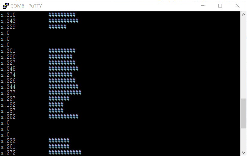 # -*- coding: utf-8-*- import pyb #导入库 led = pyb.LED(1) #创建红色led对象 chx = pyb.ADC(pyb.Pin('A4')) #创建ADC对象,PA4 usb = pyb.USB_VCP() #创建USB虚拟串口 def loop(): global led, chx, usb x = chx.read() #读取ADC电压值 i = x // 33 s = "x:%d\t\t%s\r\n"%(x,'#'*i) usb.write(s) #向虚拟串口发送ADC值 led.toggle() #红色LED状态翻转 pyb.delay(250) while True: loop()