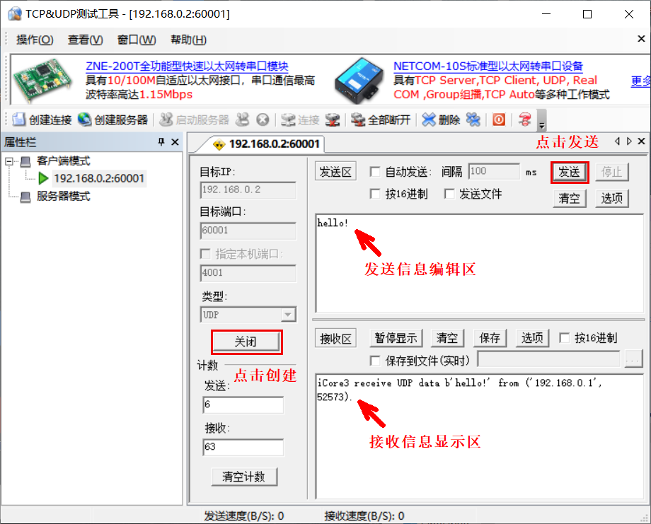 在发送区编辑完要发送的数据后,点击发送即可收到iCore3的回复信息,如下图所示: UDP通讯界面